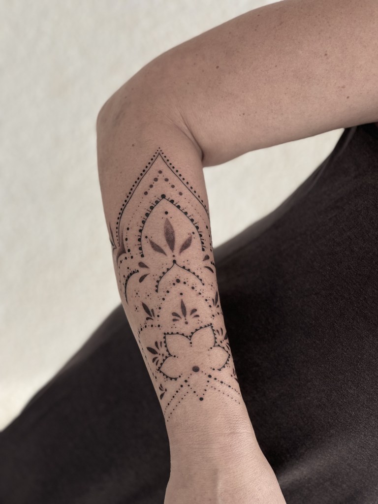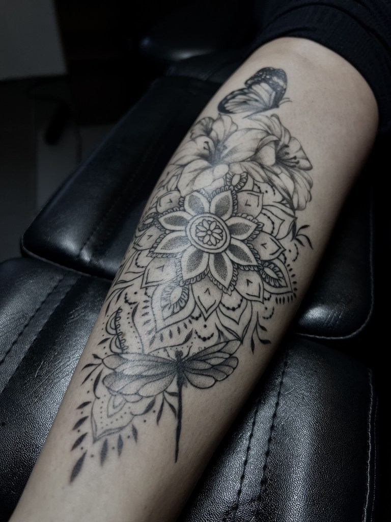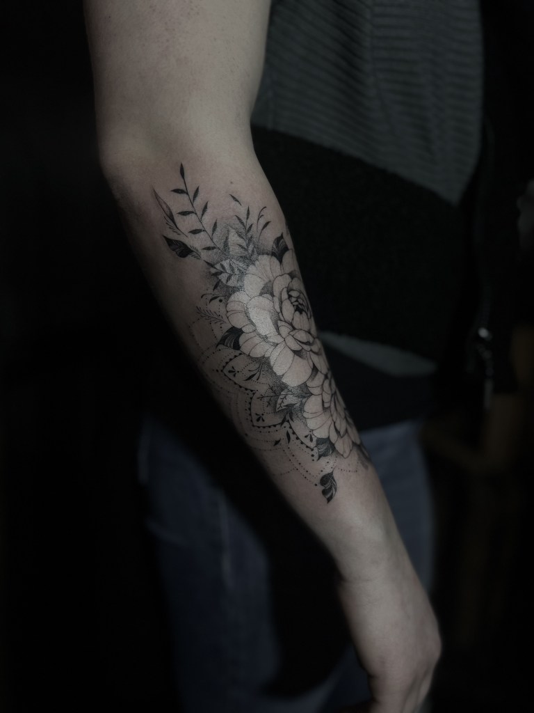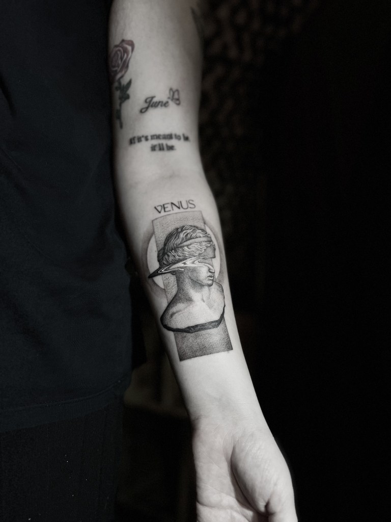 Am liebsten arbeite ich im Fineline, Mikrorealismus und Dotwork. Bei Statuen, Floralen Motiven oder sogar einer Mischung aus realistischen Motiven und Geometrik bin ich sofort dabei. In Zukunft möchte ich außerdem noch ganz viel zum klassischen Realismus dazu lernen!